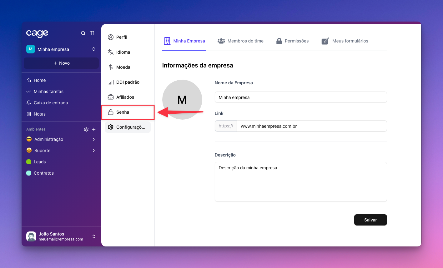 Nesta aba, você conseguirá alterar sua senha, para realizar isso, basta