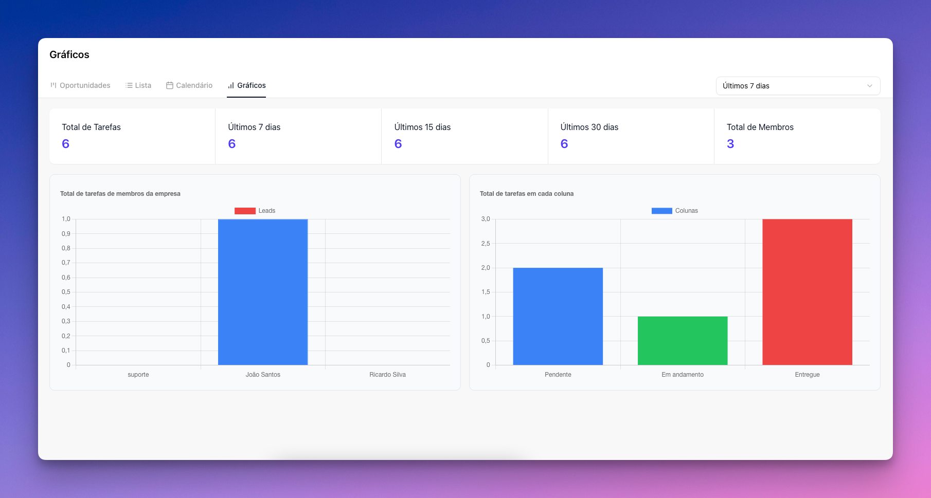 Este formato demonstra gráficos e estatísticas sobre os seus cards, é uma forma mais fácil de administrar suas tarefas e gerenciá-las, é possível alterar os dias em que deseja ver seus cards.
