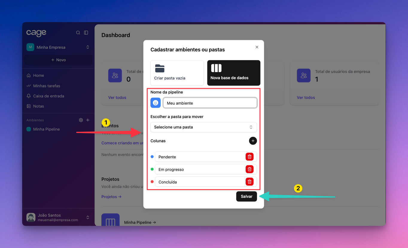 Para criar uma base de dados (Pipeline) ou uma pasta nova, Clique no + (ao lado da aba Ambientes na barra lateral da plataforma).