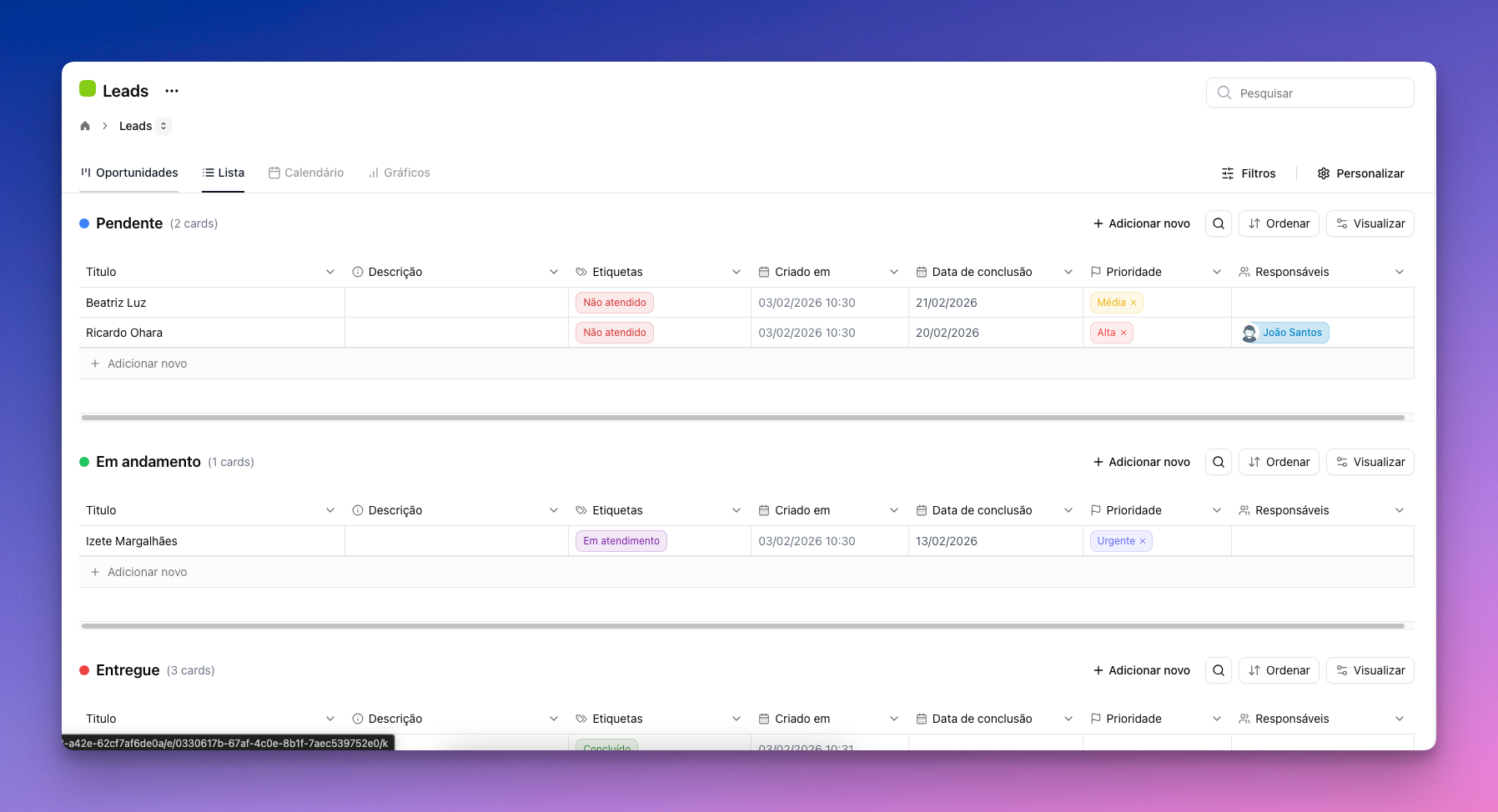 Essa forma possibilita que você enxergue seus cards de forma mais compacta, porém mais detalhada, também é possível alternar a ordem em que lhe aparece e o que gostaria de visualizar em cada tarefa (Exemplo: caso não queira visualizar o nome do cliente, é possível filtrar e não aparecer mais).