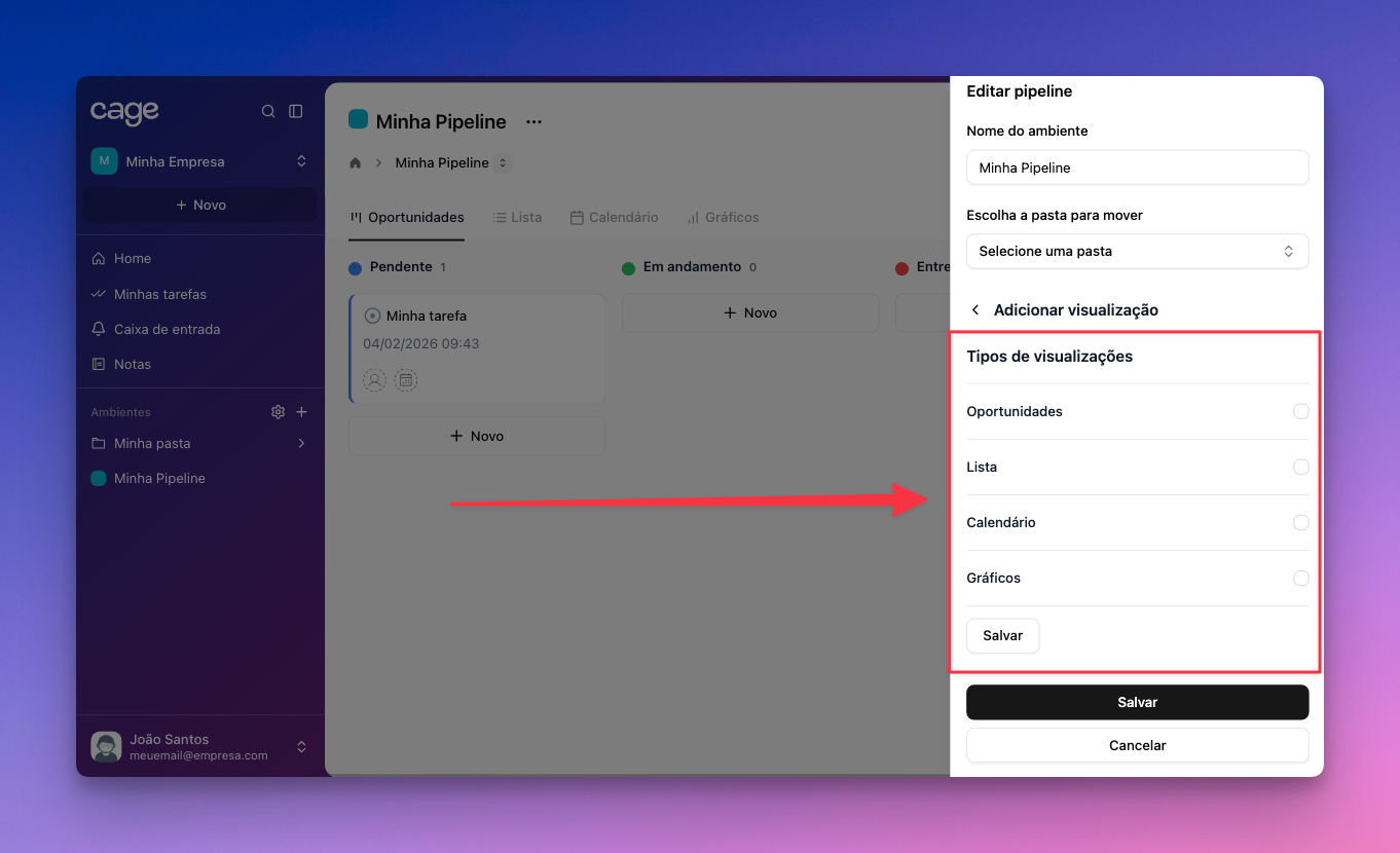 Para adicionar outros modos de visualizar a pipeline, entre na aba “Adicionar visualização” e marque os quadradinhos das formas que deseja ter em seu pipeline e salve a configuração.