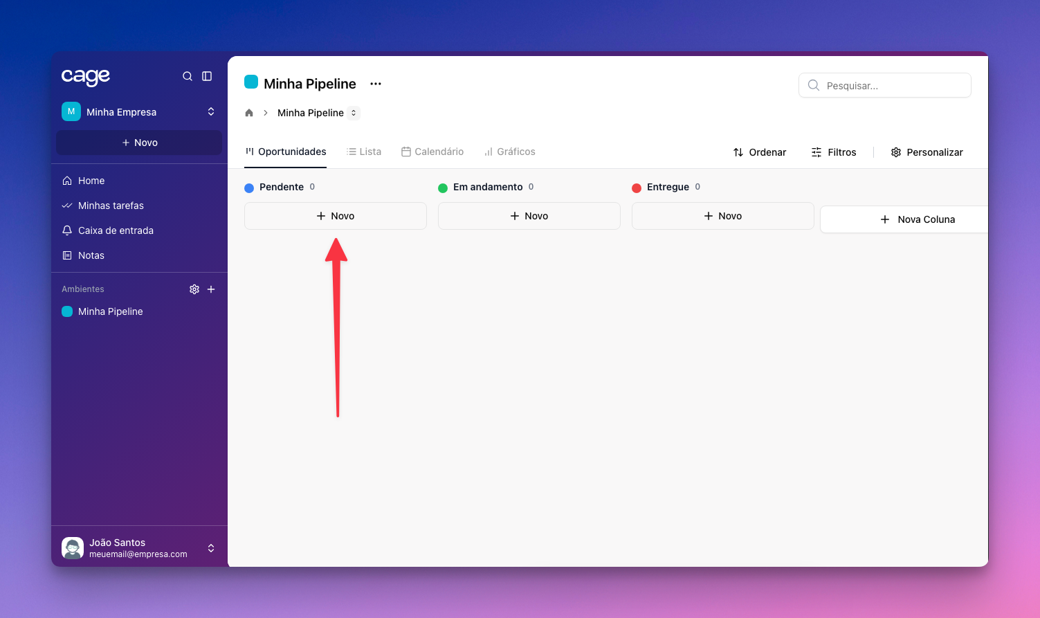 - Caso queira adicionar uma coluna de sua pipeline, clique no botão "+" e coloque o nome que desejar.