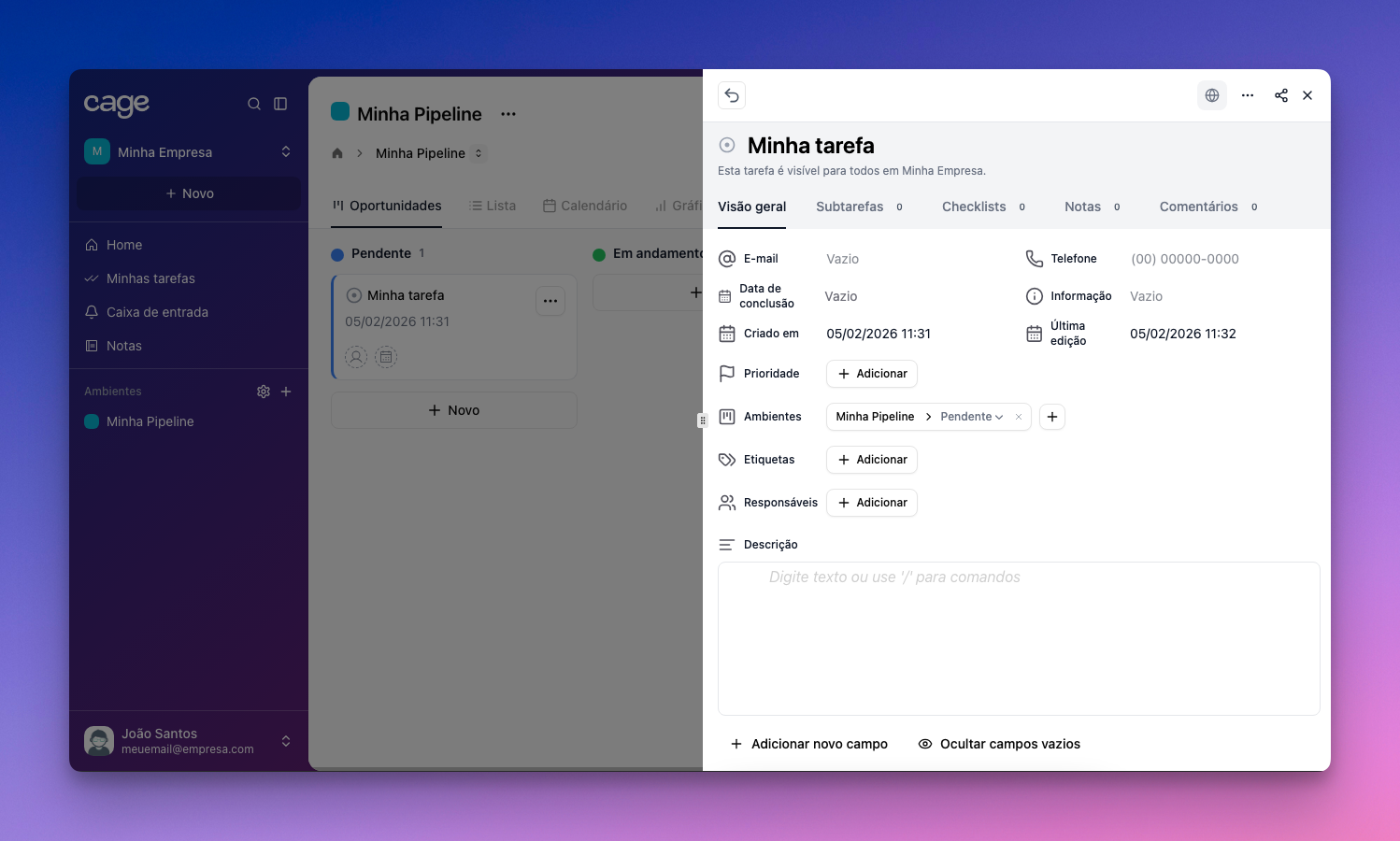 Após criá-lo, clique na tarefa e aparecerá o local onde você poderá colocar informações, subtarefas, checklists, notas e comentários sobre o cliente.