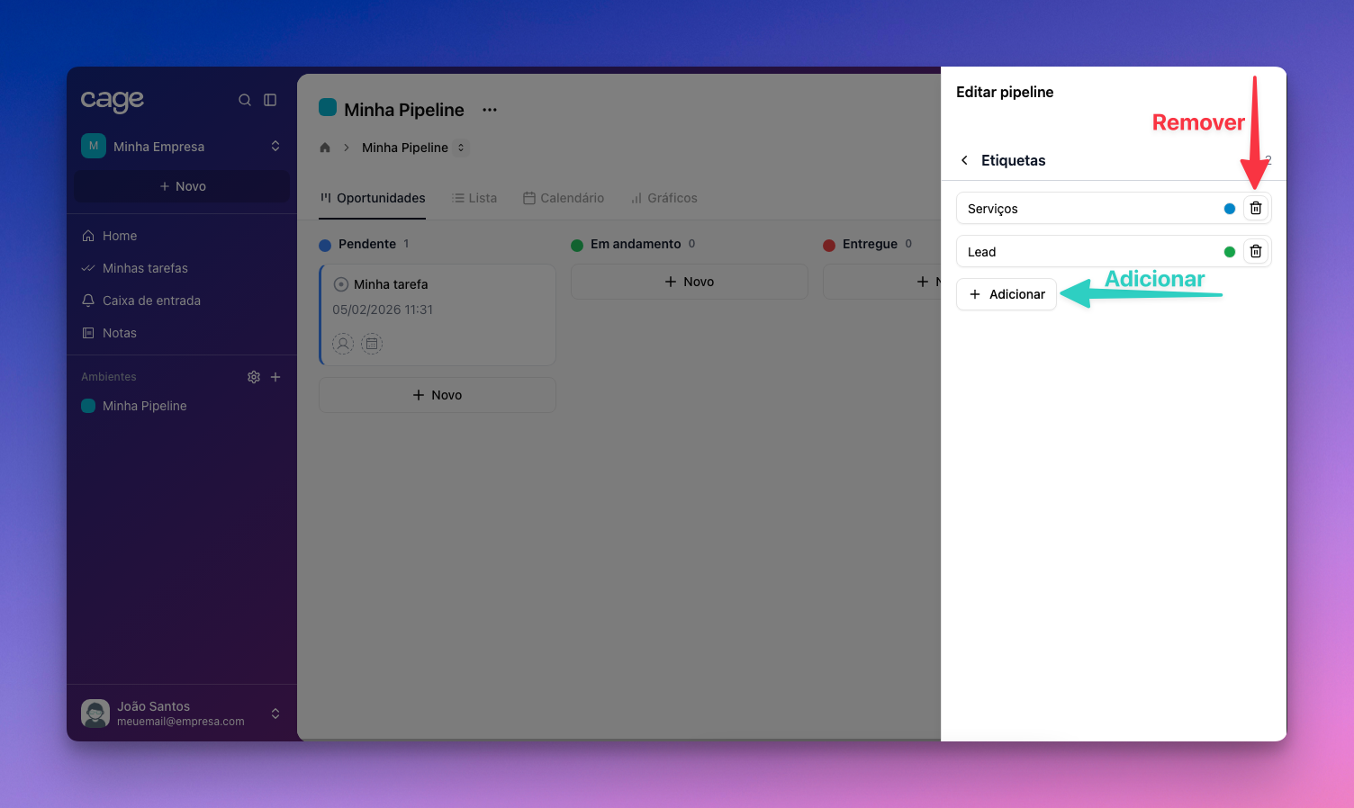 Para adicionar ou excluir uma etiqueta, é simples: clique na aba “Etiquetas". Para acrescentar a etiqueta, clique no botão “Adicionar”; para excluir, clique no ícone da lixeira.