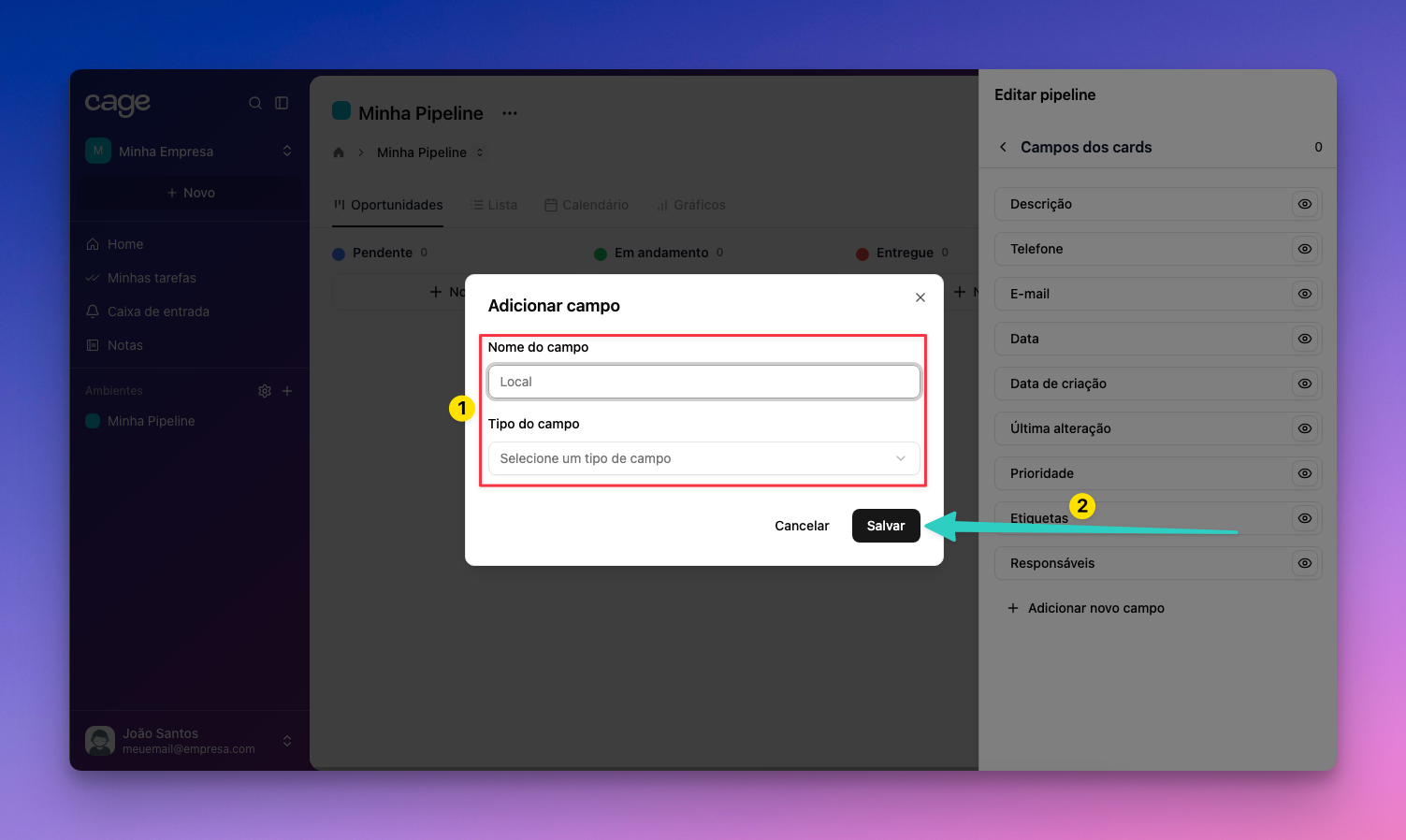 Na aba “Campos dos cards”, aperte em “Adicionar novo campo”