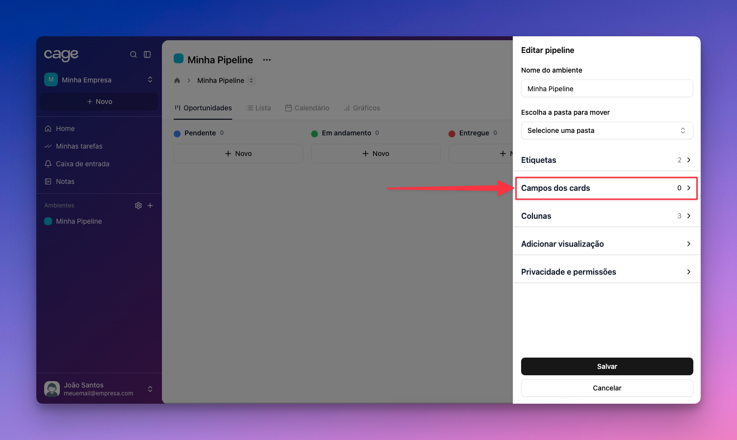 Vai aparecer uma aba “Editar pipeline”, então aperte em “Campos dos cards”.