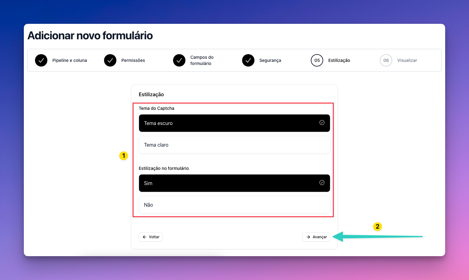 Na aba “Estilização”, você terá que selecionar as seguintes opções: