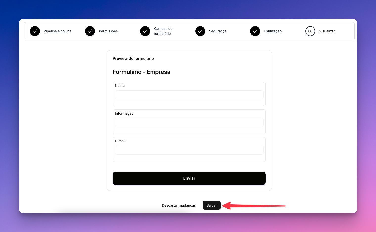 Nesta ultima aba “Visualizar”, mostrará como ficou o seu formulário e apenas aperte em “Salvar”.