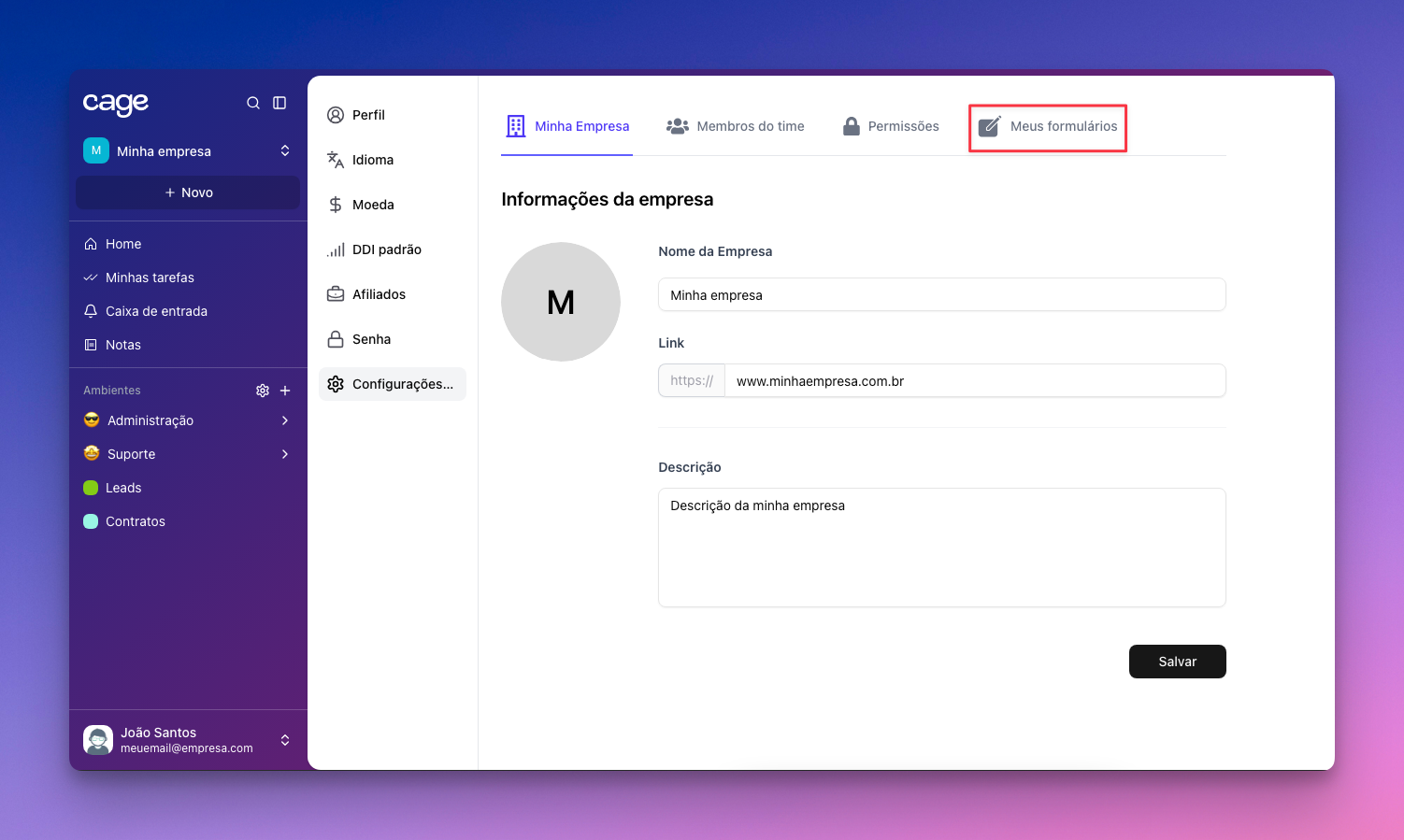Pronto! Após salvar, seu formulário estará criado e disponível para uso. A partir desse momento, você já poderá incorporá-lo ao seu site e começar a receber leads e contatos diretamente na plataforma Cage, com todas as respostas organizadas no ambiente e pipeline definidos.
