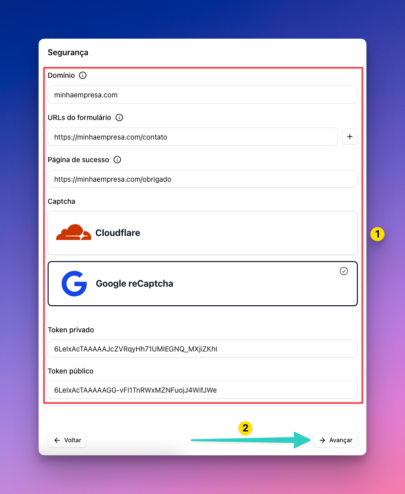 Selecione o Captcha em que você adota e coloque os tokens nos espaços solicitados.