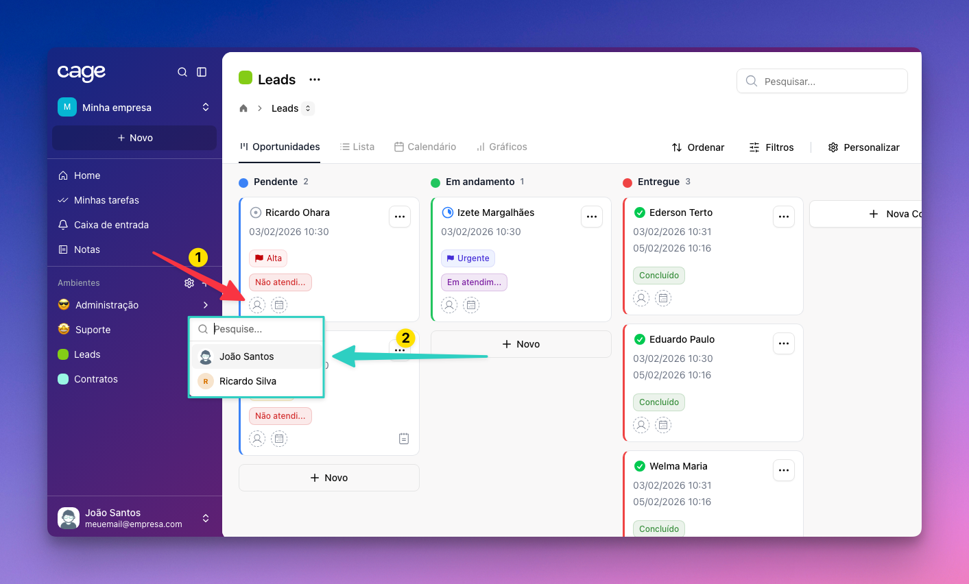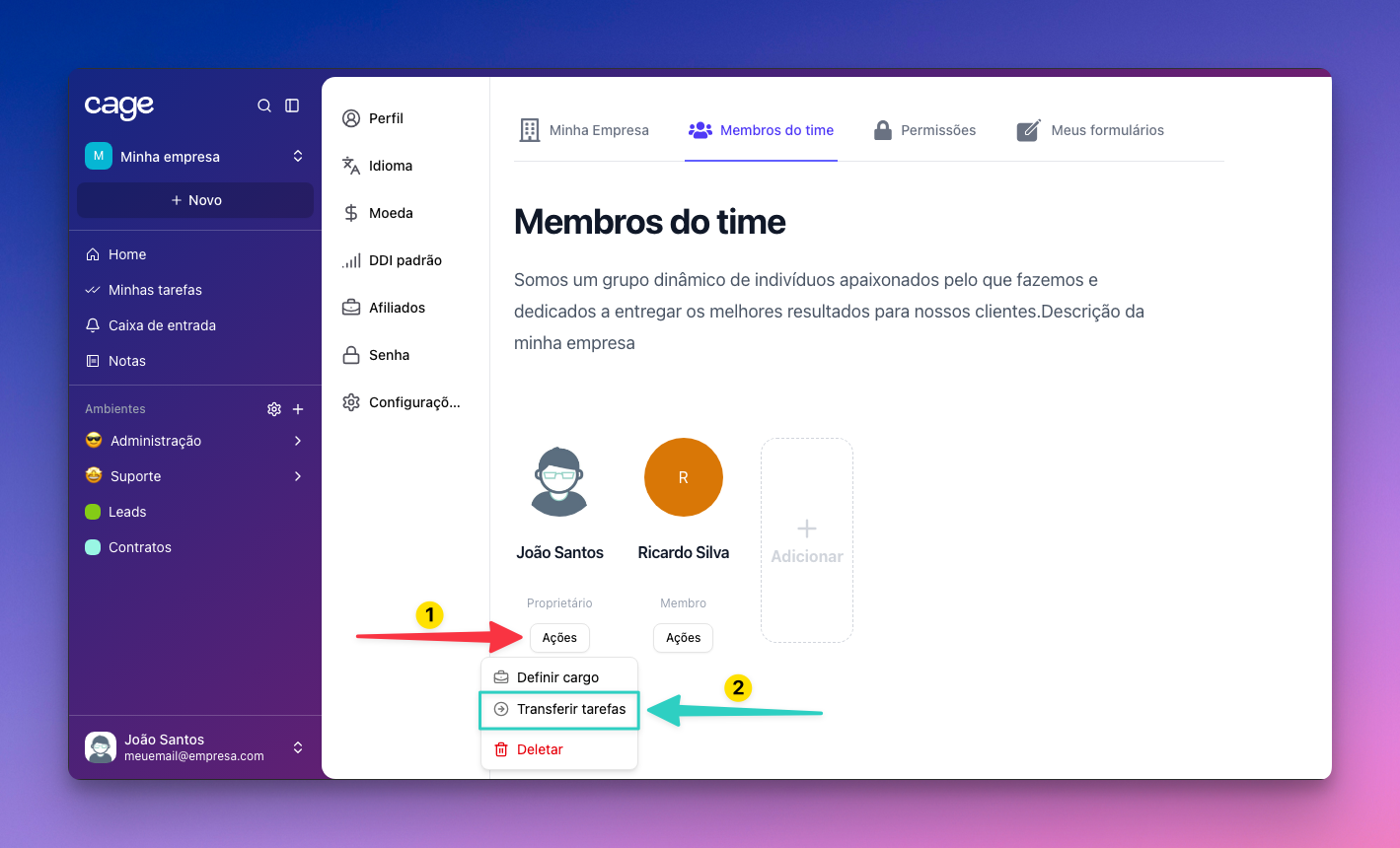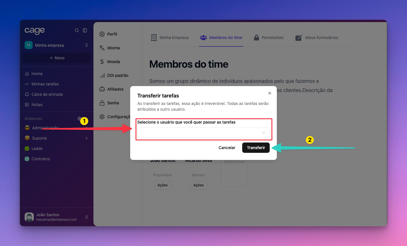 Na plataforma da Cage tem uma funcionalidade de transferencia de tarefas para outros usuários da sua empresa e tem duas formas de se realizar isso: