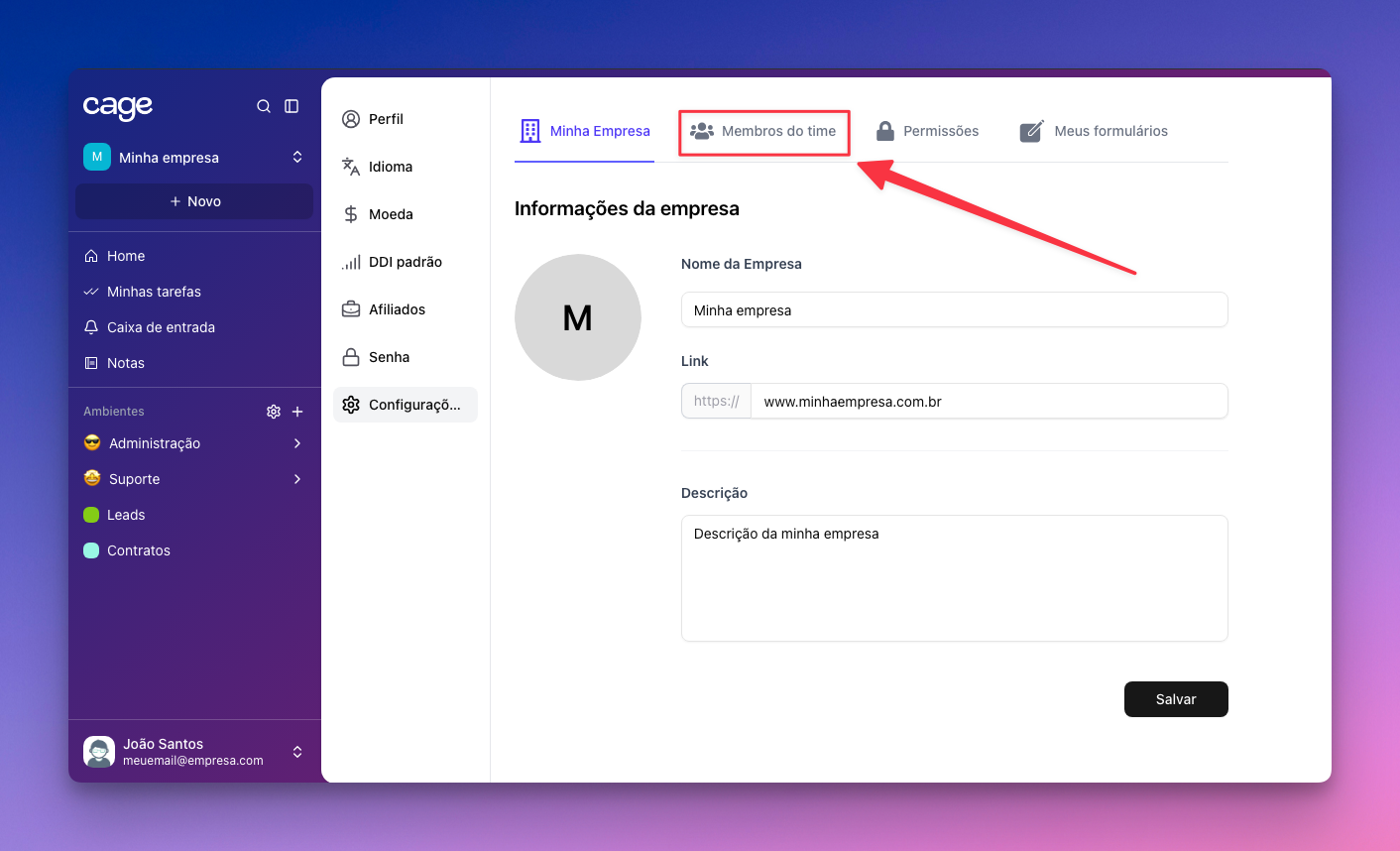 Nas configurações da empresa, clique na aba “Membros do time”.